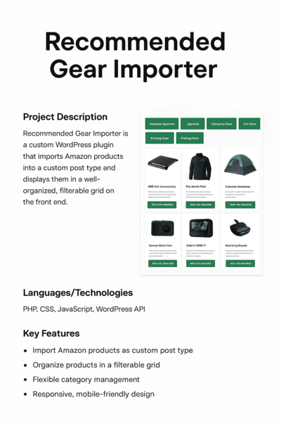 Recommended Gear Importer is a custom WordPress plugin that imports Amazon products directly into a WordPress site, categorizes them automatically, and displays them on the front end with a responsive grid and anchor filter buttons. Users can manage categories, schedule imports, and display products with featured images, titles, and truncated descriptions, enhancing product visibility and site usability.