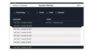 Dynamically generates an HTML sitemap of blog posts organized by categories.