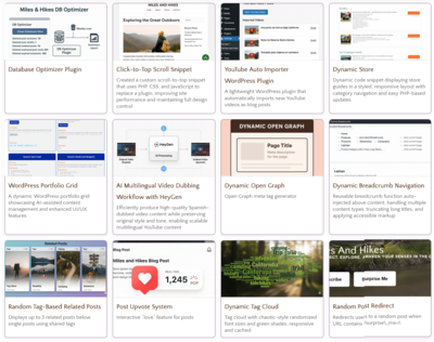 A dynamic WordPress portfolio grid showcasing AI-assisted content management and enhanced UI/UX features